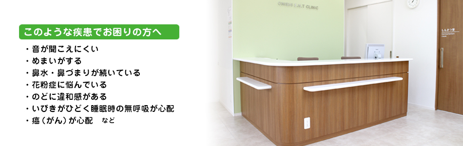 耳の病気、鼻の病気、のどの病気の治療、いびき・睡眠時無呼吸症候群の治療を行っております。当院では痛みや症状を丁寧にお聞きし、安心して治療を受けられる環境作りに努めています。